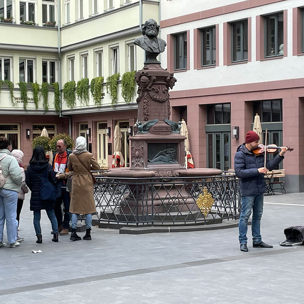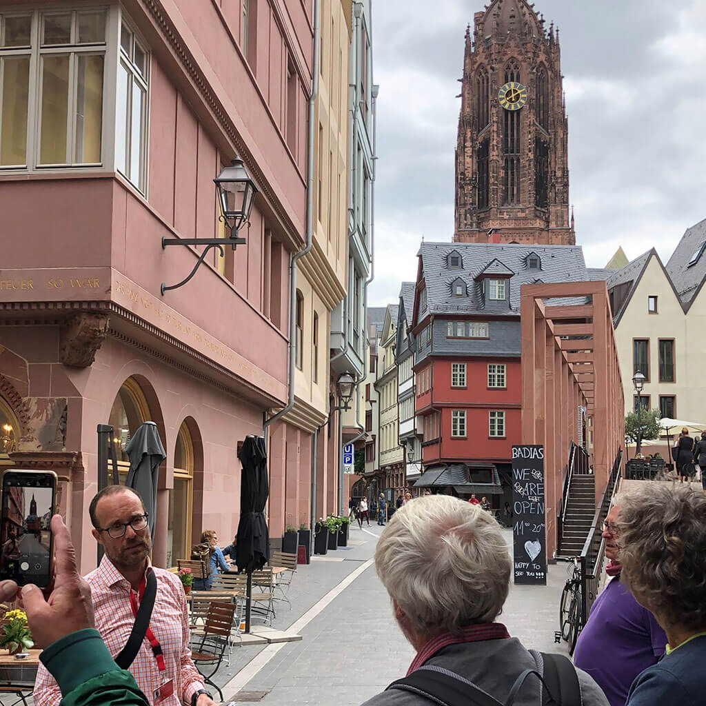 Mittels Fakten, Daten, Geschichten und spannende Anekdoten, geben wir Ihnen einen Überblick über die historischen Ereignisse und die Verschmelzung der „Neuen Altstadt“ mit dem täglichen Leben Frankfurts. Spüren Sie die unerwartet charmante Atmosphäre der gepflasterten Gassen, gesäumt von Rekonstruktionen und inspirierten Nachbauten direkt am Römerberg. Kommen Sie mit uns zurück in die Zukunft und tauchen Sie entspannt ein in die reiche Geschichte und Kultur Frankfurts.